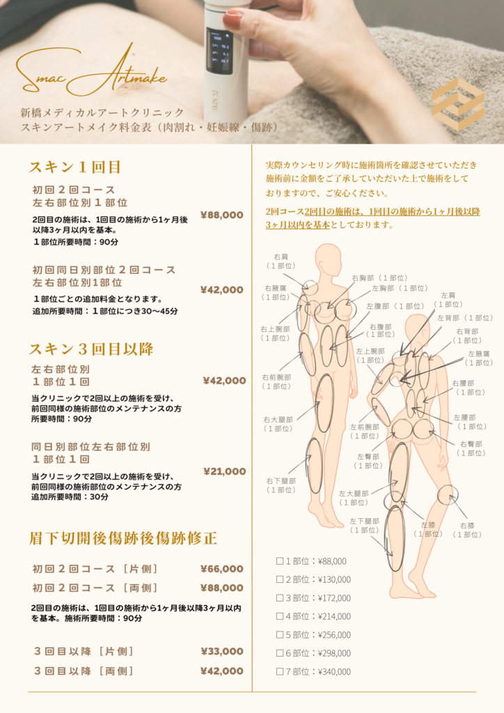 スキンメディカルアートメイクとは、ストレッチマーク(肉割れ、妊娠線)、傷跡などを医療アートメイクの技術によって、施術部位に色素を注入し色味を調整することで傷跡を目立たなくさせる施術です。